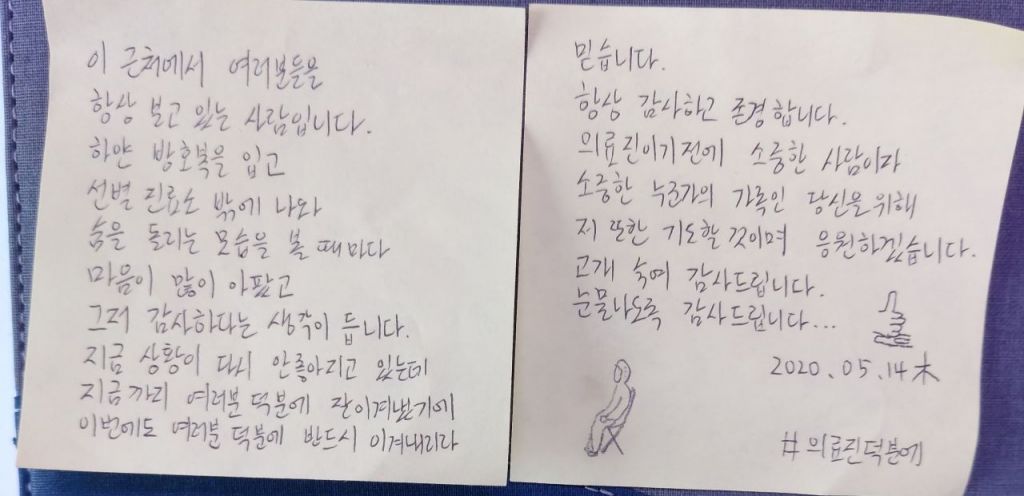[아시아경제 호남취재본부 박선강 기자] 최근 코로나19 장기화로 선별진료소 의료진들이 연일 구슬땀을 흘리고 있는 가운데 광주광역시 동구보건소 선별진료소에 학생, 주민들의 손 편지가 잇따라 잔잔한 감동을 주고 있다.