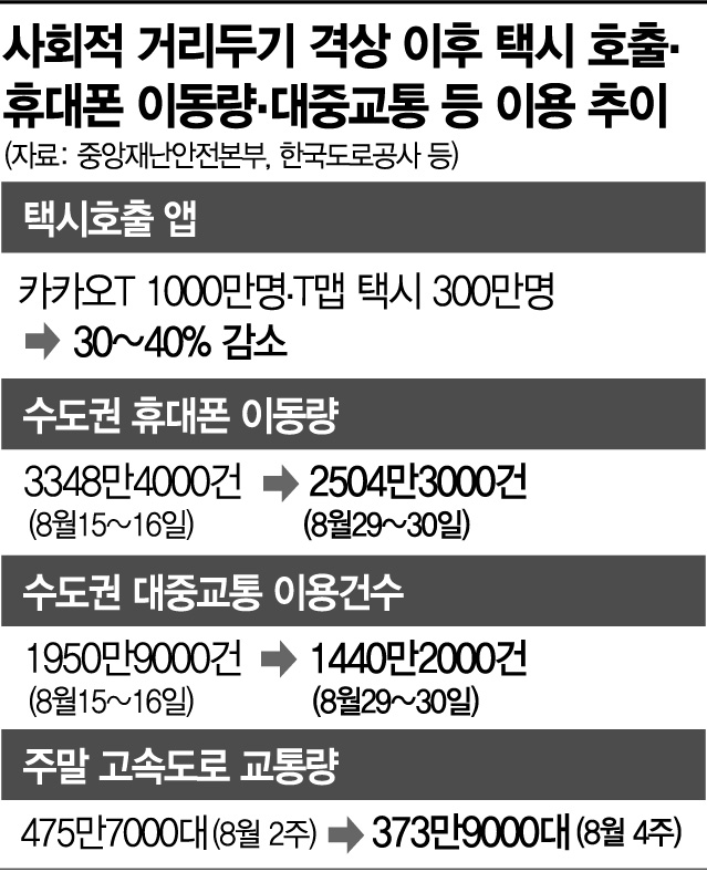 택시뿐 아니라 버스와 지하철 등 수도권의 대중교통 이용 건수도 줄었다. 중앙재난안전대책본부에 따르면 지난달 29~30일 수도권의 주말 대중교통 이용 건수는 1440만2000건으로 거리두기 격상 전 주말인 지난달 15~16일 1950만9000건보다 26.2% 감소했다. 정부가 이 기간 실거주 지역 외 다른 시군구의 행정동을 방문해 30분 이상 체류한 경우를 이동 건수로 집계한 '휴대폰 이동량'도 3348만4000건에서 2504만3000건으로 25.2% 떨어졌다.