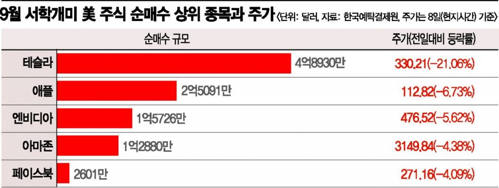 문제는 이들 종목에 국내 투자자들의 순매수가 집중돼 있어 손실이 우려된다는 점이다. 한국예탁결제원에 따르면 이달 들어 지난 7일까지 국내 투자자들은 테슬라를 4억8930만달러 순매수하며 가장 많이 사들였다. 애플(2억5091만달러), 엔비디아(1억5726만달러), 아마존(1억2880만달러), 페이스북(2601만달러) 등이 뒤를 이었다.