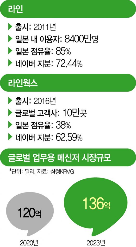 라인웍스는 네이버가 지분 62.59%를 가지고 있는 웍스모바일이 2016년 일본 시장을 겨냥해 개발한 업무용 메신저다. 당시 일본은 지금의 한국과 상황이 비슷했다. 기업 절반 이상이 개인용 메신저로 일하다보니 직원들의 업무와 생활이 분리되지 않았다. 라인웍스는 이 틈새를 파고들어 5년 만에 업계 1위로 자리잡았다. 일본 IT 조사기관인 후지키메라 연구소에 따르면 라인웍스는 기업용 메신저 시장에서 38%의 점유율을 차지하고 있다. 매출도 5년 전에 비해 38배 성장했다.