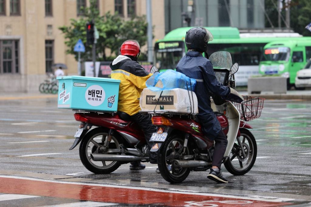 2일 오후 서울 종로구 광화문역 인근에서 배달 라이더들이 신호를 기다리고 있다. [이미지출처=연합뉴스]