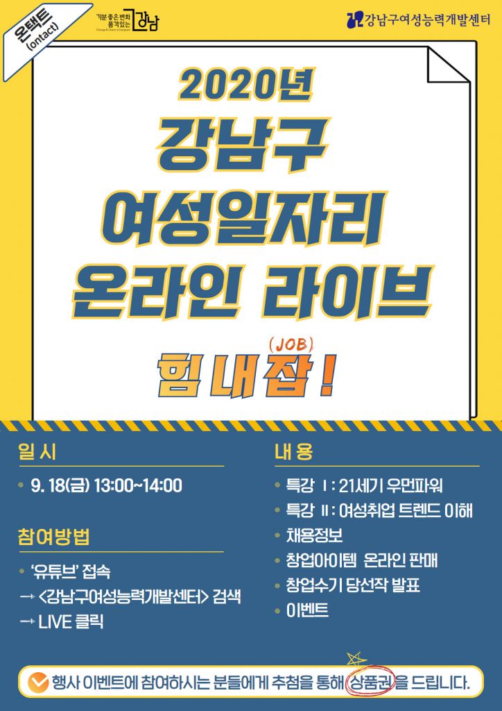 [아시아경제 박종일 기자] 강남구(구청장 정순균)가 18일 오후 1시부터 경력단절여성의 취업 지원을 위한 여성일자리 박람회 ‘힘내잡(JOB)’을 유튜브 채널 ‘강남구여성능력개발센터’를 통해 생중계한다.