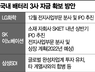 SK이노베이션 역시 내년 상반기를 목표로 소재사업 자회사 SKIET의 상장을 준비 중이다. IPO 목적은 성장 재원 확보다. 이에 더해 중장기 전략으로 전지사업부문 분사 및 기업공개도 준비하고 있다. SK이노베이션은 2025년까지 전기차 배터리 연간 생산능력을 현재 4.7GWh에서 100GWh로 약 20배 키운다는 계획을 가지고 있다. 이 기간 최소 10조원가량이 투입될 것으로 업계는 전망하고 있다. 삼성SDI의 경우에도 장기적으로는 합병이나 글로벌 자동차 업체로부터의 투자 등 다양한 방안을 모색할 것이란 예상이 나온다. 배터리 업계 관계자는 "배터리 기업들이 대규모 투자로 인해 재무구조가 약해지고 있는데 시설투자는 멈출 수 없어 특단의 대책들이 모두 필요한 상황"이라며 "삼성, LG, SK그룹 모두 배터리 사업 확대를 위한 로드맵과 그에 따른 큰 변화가 있을 것"이라고 말했다.