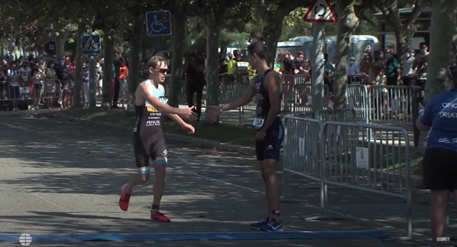 영국 트라이애슬론 선수 제임스 티아글이 스페인 선수 디에고 멘트리다에게 악수를 청하는 모습. / 사진=엘 문도 유튜브 캡처