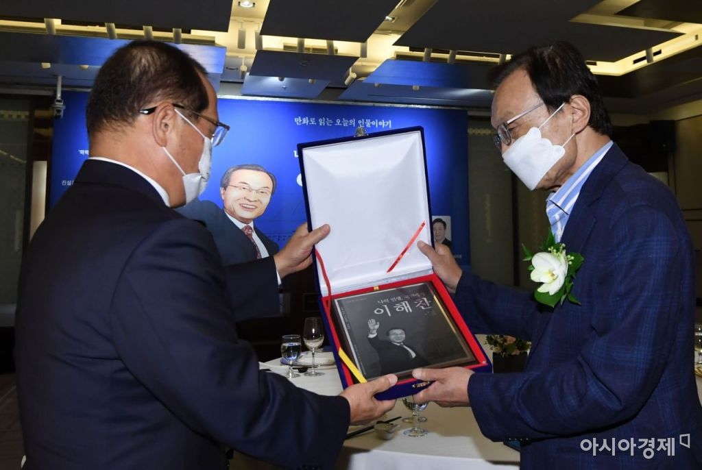 이해찬 더불어민주당 전 대표가 22일 서울 중구 조선호텔에서 열린 이해찬 더불어민주당 전 당대표 전기 '나의 인생 국민에게' 발간 축하연에서 황선우 산학연종합센터 센터장에게 발간 도서를 전달받고 있다./윤동주 기자 doso7@