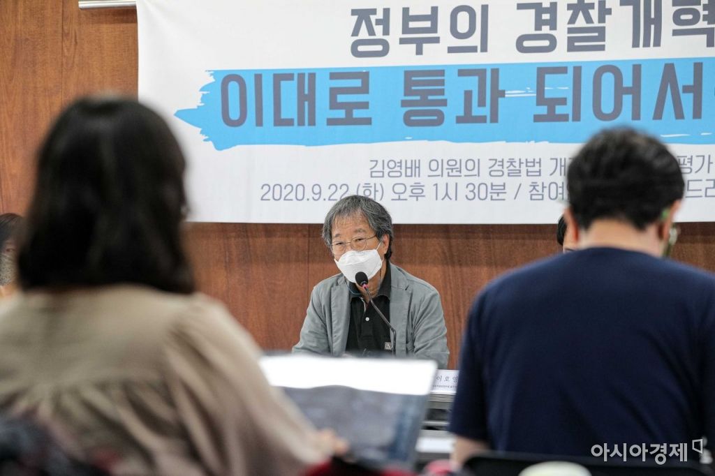 한상희 건국대학교 법학전문대학원 교수가 22일 서울 종로구 참여연대에서 열린 '김영배 의원의 경찰법 개정안에 대한 평가 기자회견'에 참석해 발언 하고 있다./강진형 기자aymsdream@