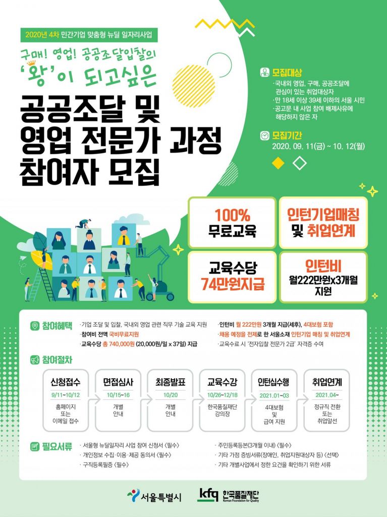 서울시에서 주관하는 '기업 맞춤형 뉴딜일자리' 사업 훈련기관으로 선정된 한국품질재단이 오는 10월 12일까지 제조서비스분야 공공조달 및 영업 전문가 과정에 참여할 훈련생을 모집한다.