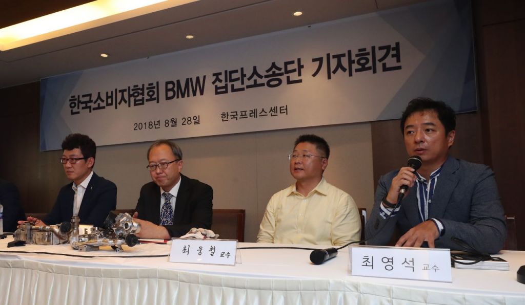 리콜대상 BMW 차량 집단소송을 진행 중인 한국소비자협회 소송지원단이 지난 2018년 기자회견을 열고 있는 모습/사진=연합뉴스