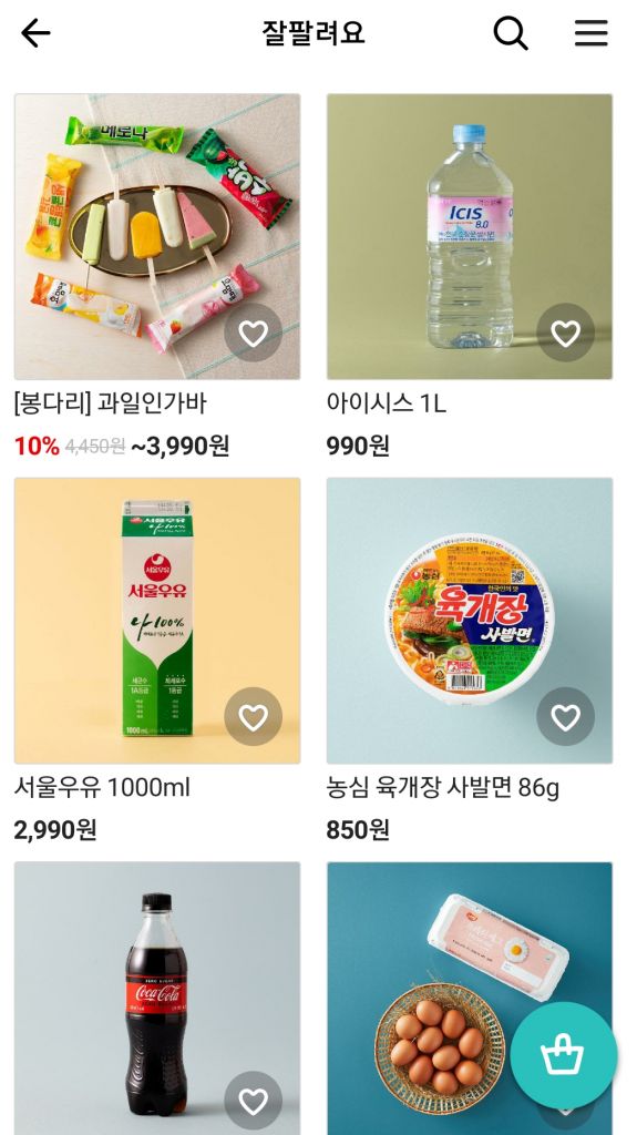 배달의 민족 앱 내 'B마트' 화면 캡쳐. 베스트셀러 항목에 아이스크림, 우유, 사발면, 콜라, 계란 등이 상위에 올라와 있다.