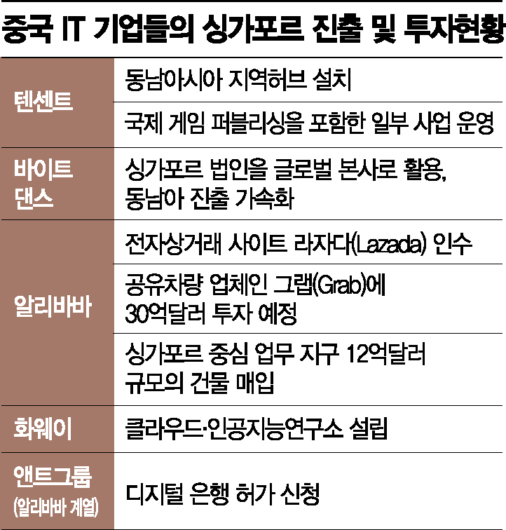 싱가포르 전자상거래업체인 라자다를 소유한 알리바바를 비롯해 미국의 십자포화를 받고 있는 화웨이도 이미 클라우드와 인공지능 연구소를 싱가포르에 설립한 상태다. 중국 증권업계 2위인 하이퉁증권, 알리바바 금융자회사인 앤트그룹 등도 최근 싱가포르에 지사를 설립하거나 현지 기업들과의 파트너십을 추진하고 있다. 중국AI 스타트업인 센스타임, 온라인 여행사 씨트립, 소셜네트워크 업체 YY, 통신그룹 차이나모바일등도 이미 진출해 있다.