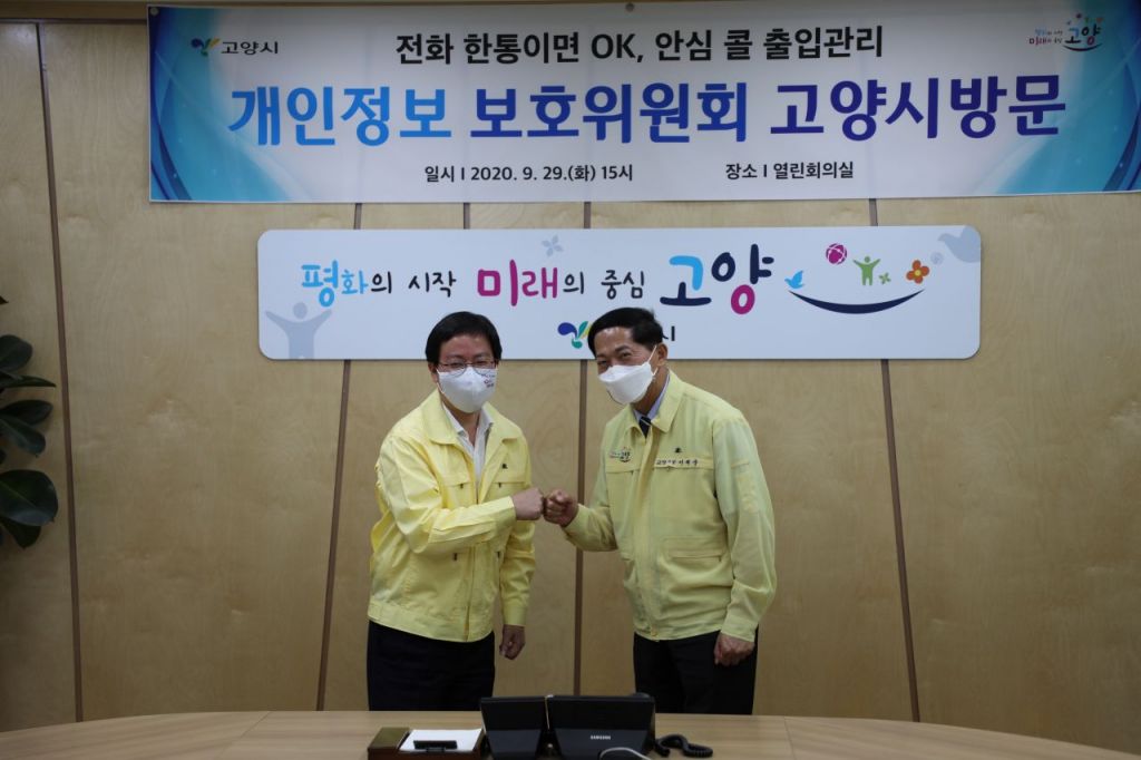 최영진 개인정보보호위원회 부위원장(왼쪽)이 이재준 고양시장을 만나 '안심콜' 활용 및 실시지역 확대를 위한 다양한 의견을 교환한 뒤, 주먹 인사를 하고 있다.[사진=개인정보보호위원회 대변인실 제공]