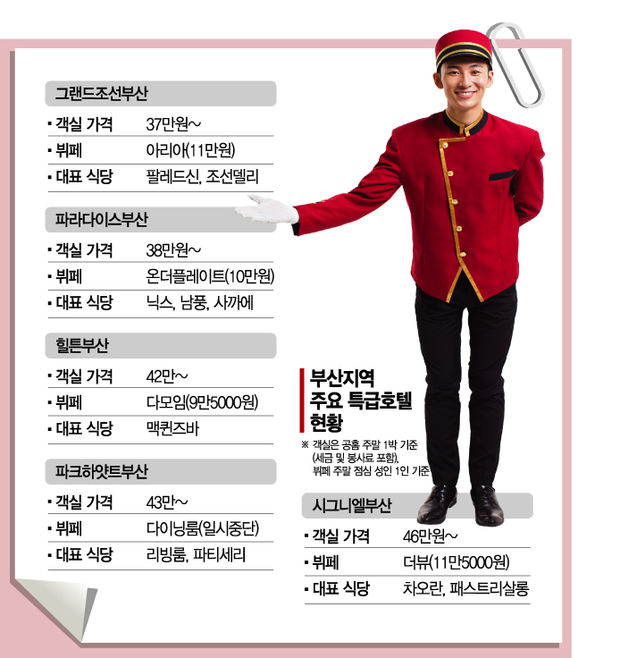 10월 한 달 사전 예약률은 일반 신규 오픈 호텔들의 평균 수준인 50% 안팎을 훨씬 뛰어넘는 수준으로 알려졌다. 8~9월 예약 취소 손님들에게 지급한 호텔 무료 투숙권이 포함돼 있지만 예상보다 높은 예약률에 호텔측은 고무돼 있다. 그랜드조선 부산이 개관하면서 부산지역에만 '시그니엘 부산'과 '파크 하얏트 부산', '힐튼 부산', '파라다이스 부산' 등과 함께 총 5여개 특급호텔들이 경쟁하게 됐다. 한정된 공간에 특급호텔들이 경쟁하게 되며 가격과 서비스 경쟁도 뜨겁다. 멤버십 할인 혜택과 패키지 프로모션 등에 나섰다. 그랜드조선 부산의 경우 '디럭스 시티뷰' 룸이 약 37만원으로 5개 호텔 중 가장 저렴한 편이다. 가장 비싼 곳은 시그니엘 부산으로 '그랜드 디럭스 더블 오션뷰' 룸이 약 46만원에 달한다. 뷔페 식당도 관심거리다. 5개 호텔 모두 일요일 점심 성인 1인 기준 9만5000~11만원대에 뷔페 서비스를 제공하고 있어 경쟁이 치열하다.