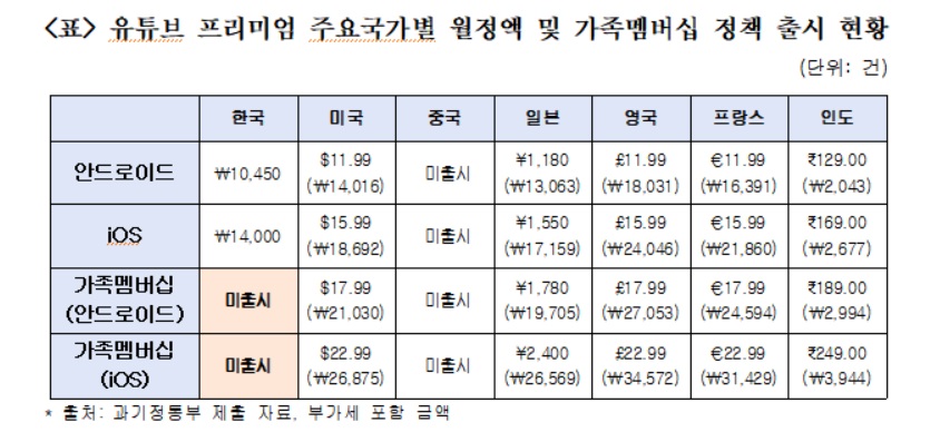 유튜브 측은 이에 대한 변 의원실 질의에 "국가별로 시장환경이 다르고 제품 출시에는 다양한 요인들이 고려되기 때문에 한국에 출시되지 않는 이유를 짚어 말하기는 어렵다"며 "가족멤버십이 출시되지 않은 국가는 한국 외에도 베네수엘라, 벨라루스, 슬로베니아, 아이슬란드, 이스라엘 등이 있다"고 답했다.