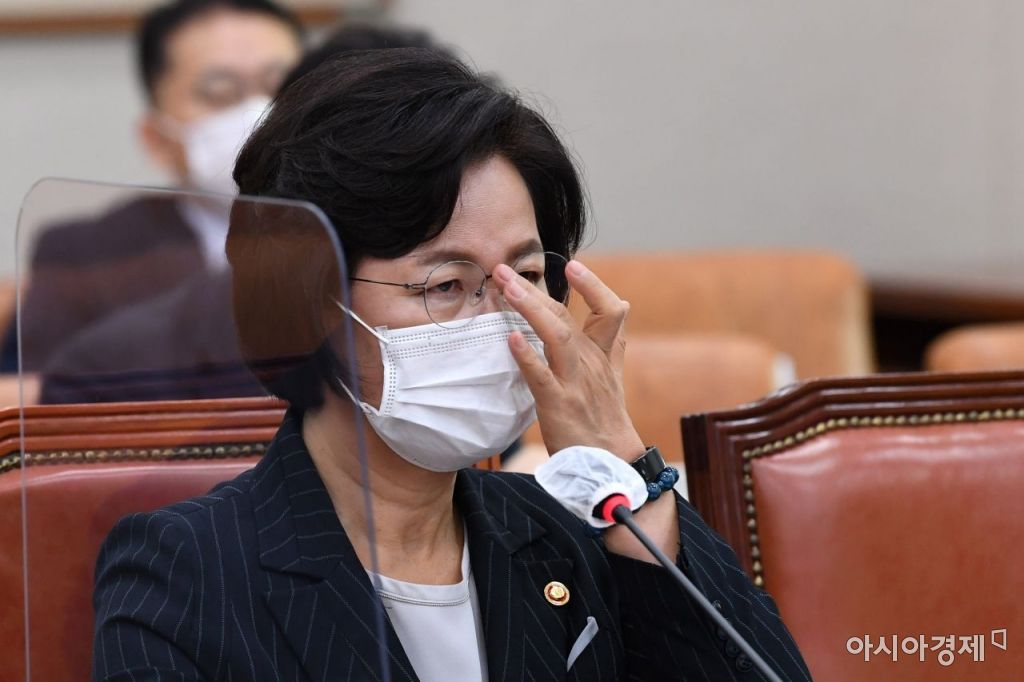 추미애 법무부장관이 12일 국회 법사위원회에 법무부 등에 대한 국정감사에 출석, 신중한 표정으로 안경을 바로쓰고 있다./윤동주 기자 doso7@