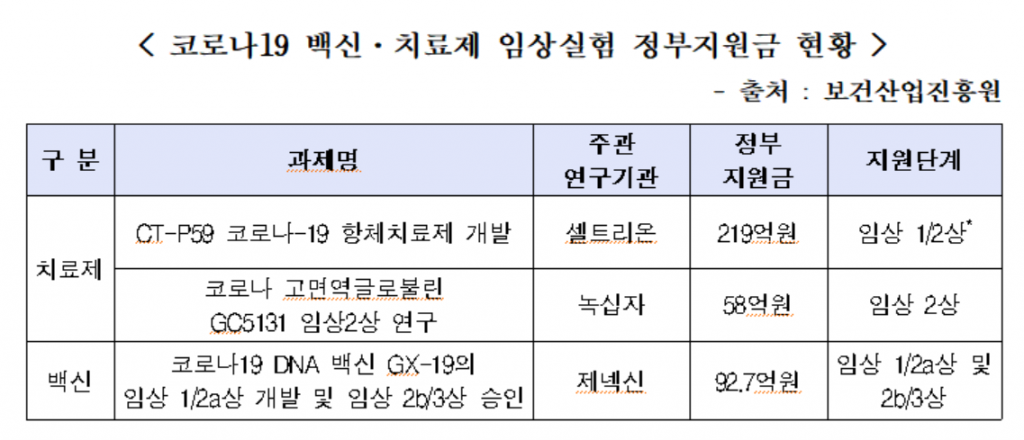 정부가 지난 7월 코로나19 백신·치료제 임상 지원을 위해 실시한 공모에는 20곳이 응모했지만 범정부지원단의 심사를 통과한 곳은 3곳뿐인 것은 보건당국이 관련 임상을 승인한 곳이 26곳에 달한다는 것과 대조된다는 지적이다.