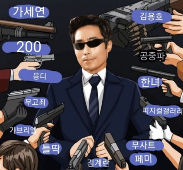 해당 사진에는 이근 전 대위를 총으로 겨눈 사람들의 모습이 담겼다. 총에는 최근 자신을 공격하는 가세연(가로세로연구소), 김용호, 피지컬갤러리, 김계란 등의 이름이 적혀 있다.