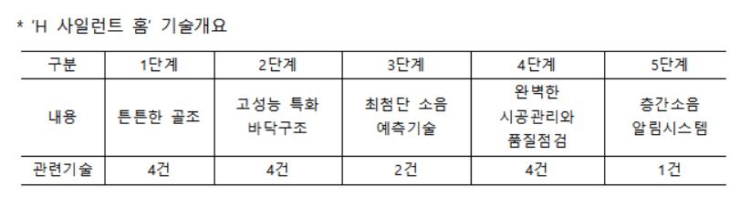 H 사일런트 홈은 ▲1단계 튼튼한 골조 ▲2단계 고성능 특화 바닥구조 ▲3단계 최첨단 소음 예측기술 ▲4단계 완벽한 시공관리와 품질점검 ▲5단계 층간소음 알림시스템으로 구성된다.
