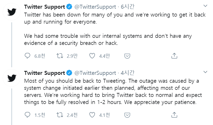15일(현지시간) 트위터는 공식 계정을 통해 "다수 사용자의 트위터가 작동이 안 되고 있어, 복구 작업이 진행중"이라면서 "내부 시스템상에 문제가 있었으며, 해킹이나 보안이 뚫렸다는 증거 등은 발견되지 않았다"고 설명했다. 이어 "이번 사용 불능 상황은 사전에 예정됐던 것보다 먼저 시스템 교체가 시작되면서, 대부분의 서버가 영향을 받게 된 것"이라며 "1~2시간이면 시스템이 완전 정상 작동하게 될 것"이라고 밝혔다.