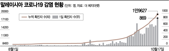 정부 당국의 이런 조치는 최근 신규 확진 사례가 급증하면서 나오게 됐다. 현지 언론은 월드오미터를 인용해 말레이시아의 코로나19 신규 확진자가 연일 사상 최고치를 경신하고 있다고 보도했다. 월드오미터에 따르면 하루 확진자는 17일 869명으로 최고치를 기록한데 이어 다음날인 18일에는 871명으로 하루만에 신기록을 갈아치웠다. 말레이시아키니는 "10월부터 하루 600명이 넘는 신규 코로나19 환자가 발생하면서 3차 확산이 본격화됐다"고 전했다.