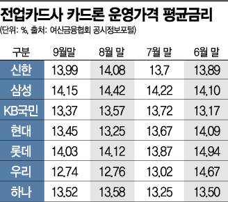 한편, 지난 9월말 7개 전업카드사(신한·삼성·KB국민·현대·롯데·우리·하나카드)의 표준등급 기준 카드론 평균금리(운영가격)는 12.74~14.15%를 기록, 전월 대비 0.02~0.27%포인트 하락했다. 7개 카드사 중 현대카드를 제외한 6개 카드사가 내렸는데, 7개사 평균값은 13.61%로 전달 13.68% 대비 0.07%포인트 인하했다.