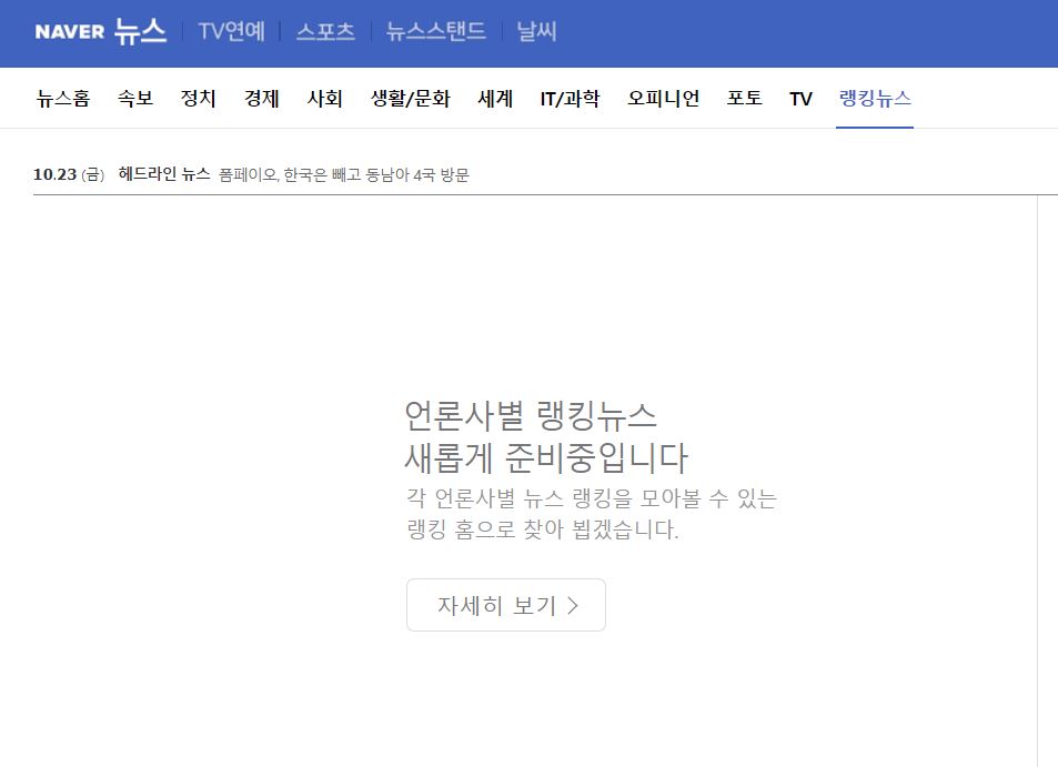 이용자는 그간 PC에서 정치·경제·사회·생활문화·세계·IT/과학 등 각 카테고리에 접속해 언론사 전체를 통합한 '많이 본 뉴스'를 확인할 수 있었다. 이제 이 자리는 '언론사별 랭킹뉴스'로 대체된다. 현재 이 페이지에 접속하면 '언론사별 랭킹홈을 준비 중'이라는 안내가 뜬다.