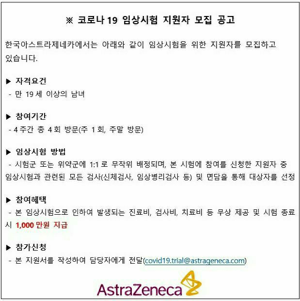식약처가 아스트라제네카의 백신에 대한 허가전담심사팀을 구성했다고 밝힌 전날 인터넷 커뮤니티와 단체 채팅방 등을 중심으로 한국아스트라제네카 코로나19 임상시험 지원자를 모집한다는 공문 형식의 이미지가 퍼졌다.