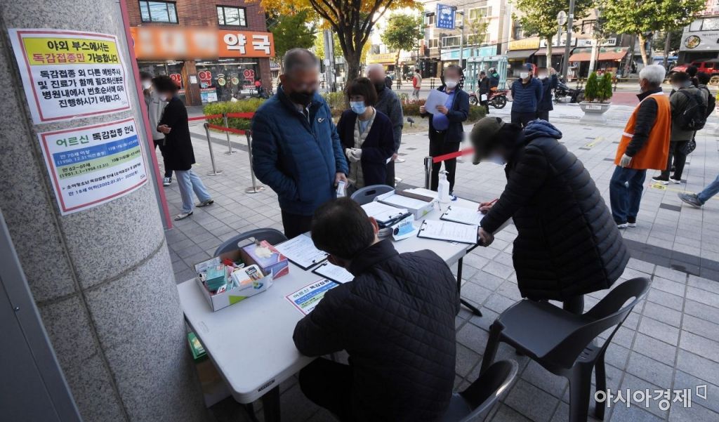 정부가 만62~69세 어르신을 대상으로 독감(인플루엔자) 백신 무료접종을 재개한 26일 서울의 한 병원 앞에서 시민들이 독감 예방접종을 위해 줄을 서 있다. 지난 9월25일 만12세 이하와 임신부, 10월13일 만13~18세, 19일 만70세 이상 무료접종을 다시 시작한 이후 접종재개 마지막 연령대가 된다. 정부는 최근 독감백신 접종 후 48명의 사망자가 발생한 것과 관련해, 지난 23일 서로 연관성이 없어 접종을 지속한다고 밝혔다./김현민 기자 kimhyun81@