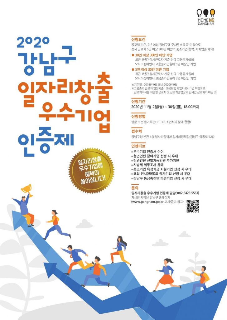 [아시아경제 박종일 기자] 강남구(구청장 정순균)가 30일까지 ‘2020 강남구 일자리창출 우수기업 인증제’에 참여할 중소기업을 모집, 우수기업 20개를 선정해 인증서와 인센티브를 제공한다.