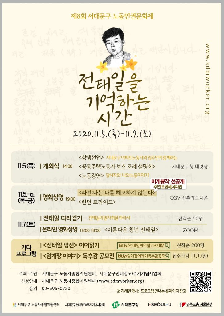 7일 오후 3시와 7시에는 영화 ‘아름다운 청년 전태일’을 화상회의 시스템을 통해 스마트폰이나 PC 등 온라인으로 볼 수 있다.