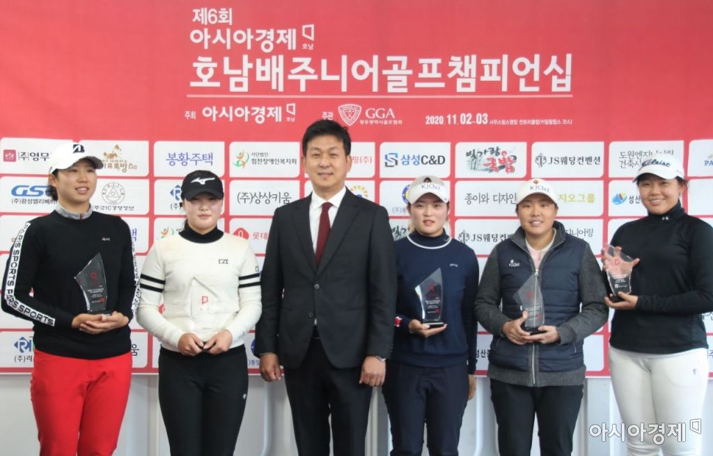 [아시아경제 호남취재본부 윤자민 기자] 지난 2~3일 사우스링스 영암 컨트리클럽(카일필립스 코스)에서 열린 제6회 아시아경제 호남배 주니어 골프 챔피언십 여자부 수상자와 이상민 아시아경제 호남 대표가 단체 사진을 찍고 있다. 사진 왼쪽부터 황연서(2위), 고지우(1위), 이상민 대표, 김서윤(3위), 이주현(5위), 나은서(5위) 학생.
