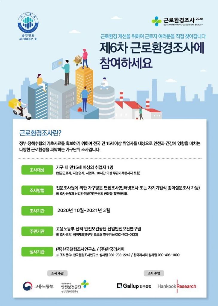 제6차 근로환경조사는 10월부터 2021년 3월까지 인구주택총조사를 기준으로 총 5만명을 시도별로 나눠 실시된다.