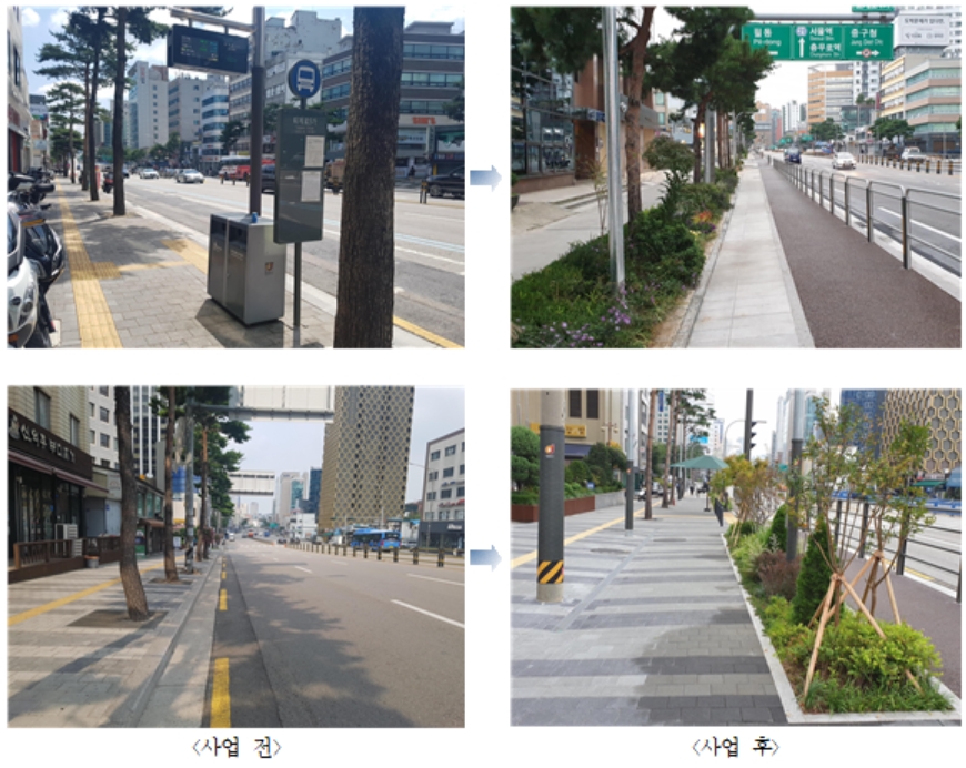 여유공간에는 보행환경에 영향을 주지 않는 범위에서 띠녹지를 조성하고 가로수를 2열로 식재했다. 특히 중구를 상징하는 소나무 가로수를 중심으로 관목류와 초화류를 다층 식재해 사계절 내내 청량감 있는 경관을 선사하는 도심숲을 조성했다.