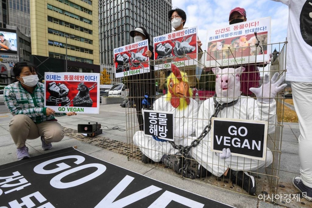 9일 서울 종로구 광화문 광장에서 비건 세상을 위한 시민모임 및 한국채식연합 등 관계자들이 완전한 채식을 촉구하는 퍼포먼스를 펼치고 있다./강진형 기자aymsdream@