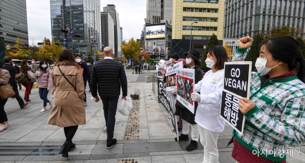 9일 서울 종로구 광화문 광장에서 비건 세상을 위한 시민모임 및 한국채식연합 등 관계자들이 완전한 채식을 촉구하는 퍼포먼스를 펼치고 있다./강진형 기자aymsdream@