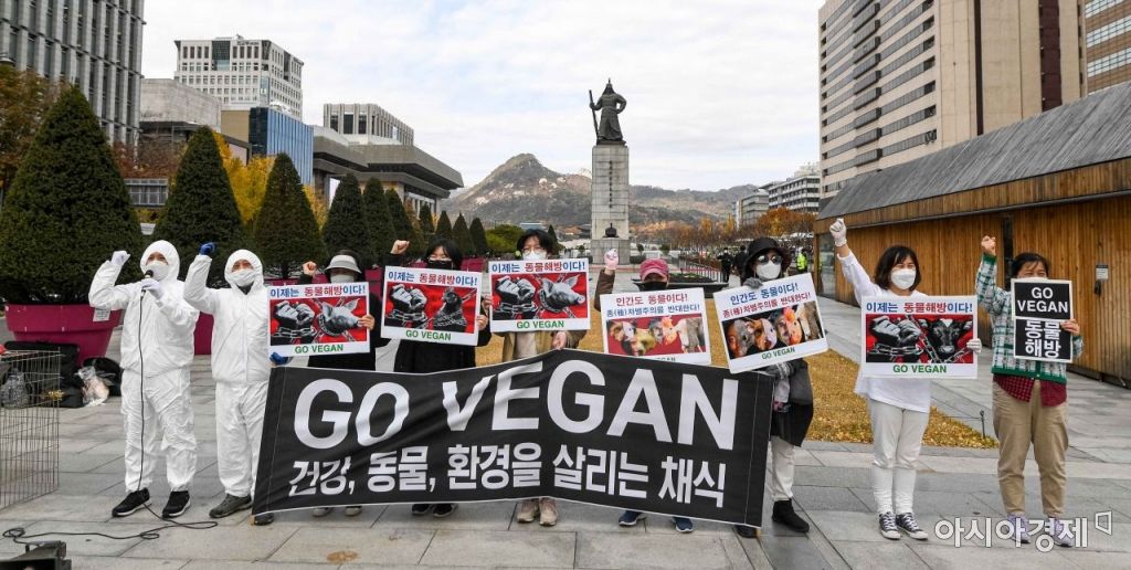 9일 서울 종로구 광화문 광장에서 비건 세상을 위한 시민모임 및 한국채식연합 등 관계자들이 완전한 채식을 촉구하는 퍼포먼스를 펼치고 있다./강진형 기자aymsdream@