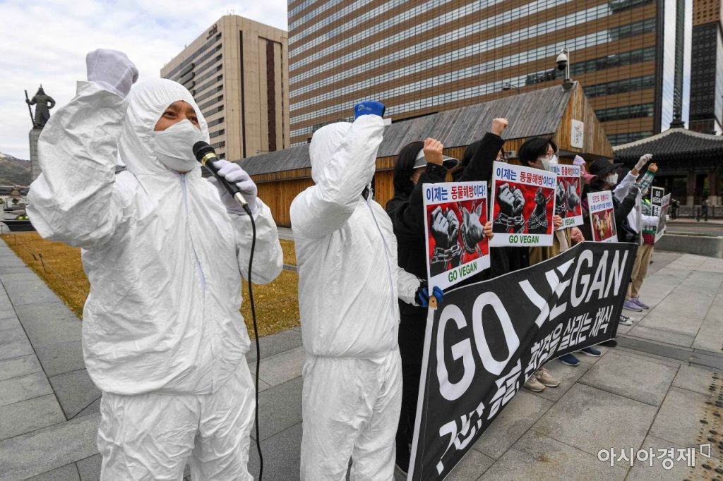 9일 서울 종로구 광화문 광장에서 비건 세상을 위한 시민모임 및 한국채식연합 등 관계자들이 완전한 채식을 촉구하는 퍼포먼스를 펼치고 있다./강진형 기자aymsdream@