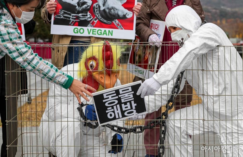 9일 서울 종로구 광화문 광장에서 비건 세상을 위한 시민모임 및 한국채식연합 등 관계자들이 완전한 채식을 촉구하는 퍼포먼스를 펼치고 있다./강진형 기자aymsdream@