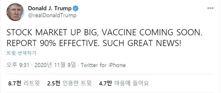 트럼프 대통령은 이날 화이자의 백신에 대한 발표 직후 트윗을 올려 "주식시장이 크게 오르고 있고, 백신도 곧 나온다. 90% 효과가 있다고 한다. 매우 좋은 뉴스!"라고 밝혔다.