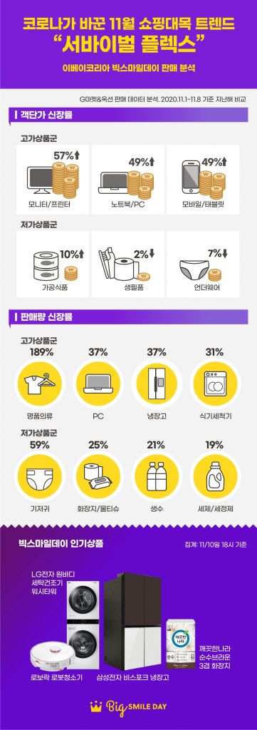 이러한 소비형태는 빅스마일데이 판매 실적으로도 나타나고 있다. 11월 10일 오후 6시 기준, 실시간 판매 실적 랭킹을 보면 G마켓에서는 ‘삼성전자 비스포크 냉장고’가 누적 매출 21억2000만원으로 2위를 기록하고 있다. ‘로보락 로봇청소기’는 누적 매출 14억, ‘깨끗한나라 순수브라운 3겹 화장지’는 7억6000만원을 기록하며 상위권에 올랐다. 옥션에서는 ‘LG전자 원바디 세탁건조기 워시타워’가 누적 매출 5억 매출로 2위를, ‘동원 라이트 스탠다드 참치’는 누적 매출 1억4000만원, '베베숲 프리미어 물티슈'도 누적 매출 1억4000만원 등 생필품도 인기를 얻고 있다.