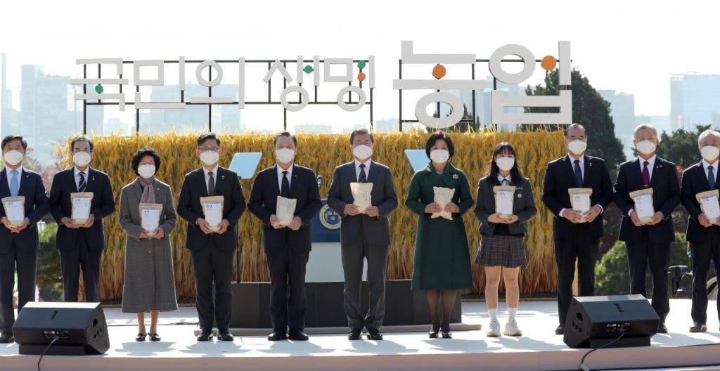11일 청와대에서 제25회 농업인의 날을 맞아 문재인 대통령(가운데)과 영부인 및 내빈이 참석한 가운데 행사 진행 후 기념 사진을 찍고 있다.