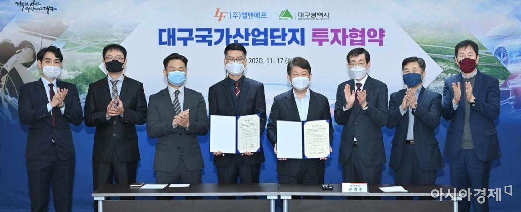 [아시아경제 영남취재본부 박동욱 기자] 대구시는 17일 오후 시청에서 권영진 시장과 지역 중견 에너지기업인 ㈜엘앤에프(대표이사 허제홍)의 최수안 사장이 참석한 가운데 대구국가산업단지내 2차전지용 양극재를 생산하는 제4공장 건립 투자협약(MOU)을 체결했다.