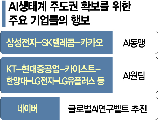 삼성전자와 SK텔레콤, 카카오는 'AI 동맹'도 맺고 있다. 구글, 아마존 등 글로벌 공룡들과의 경쟁에서 뒤처지지 않기 위한 합종연횡이다. KT, LG유플러스 역시 산학연 협의체인 'AI 원팀'을 구축해 기술 개발에 속도를 내고 있다. 네이버는 네이버랩스 등 AI 연구조직을 통해 올해 세계 최고 수준의 AI 학회에서 40편 이상의 논문결과를 발표할 정도로 연구 역량을 인정받고 있다.