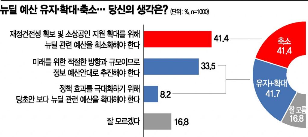 아시아경제가 윈지코리아컨설팅에 의뢰해 지난 15일~16일 전국 18세 이상 유권자 1000명을 대상으로 여론조사(휴대전화 가상번호 100%, 자동응답)를 실시한 결과 뉴딜 예산에 대해 '현행 유지(33.5%)+예산 확대(8.2%)'를 응답한 비율은 41.7%로 나타났다. 하지만 '예산 축소'를 응답한 비율도 41.4%를 기록해 오차범위 내에서 팽팽하게 의견이 갈린 것으로 집계됐다. '잘 모르겠다'는 응답은 16.8%였다.