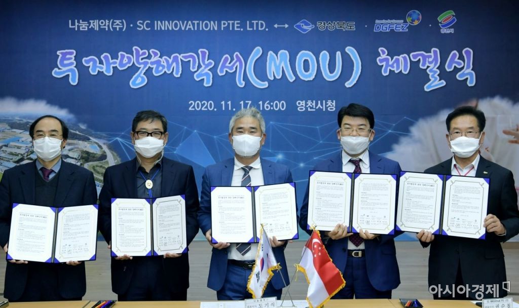 [아시아경제 영남취재본부 박동욱 기자] 영천시는 17일 경북도, 대구경북경제자유구역청, ㈜나눔제약, 싱가포르 SC이노베이션 등과 함께 산업단지 입주를 위한 다자간 투자양해 각서를 체결했다. 이로써 영천산업단지는 7년 만에 100% 분양 완료됐다.