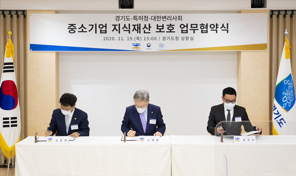 20일 변리사회에 따르면 전날 변리사회 홍장원 회장은 이재명 경기도지사, 김용래 특허청장을 만나 경기도에서 활동하는 중소·스타트업의 기술보호에 협력하는 내용의 다자간 업무협약을 체결했다.