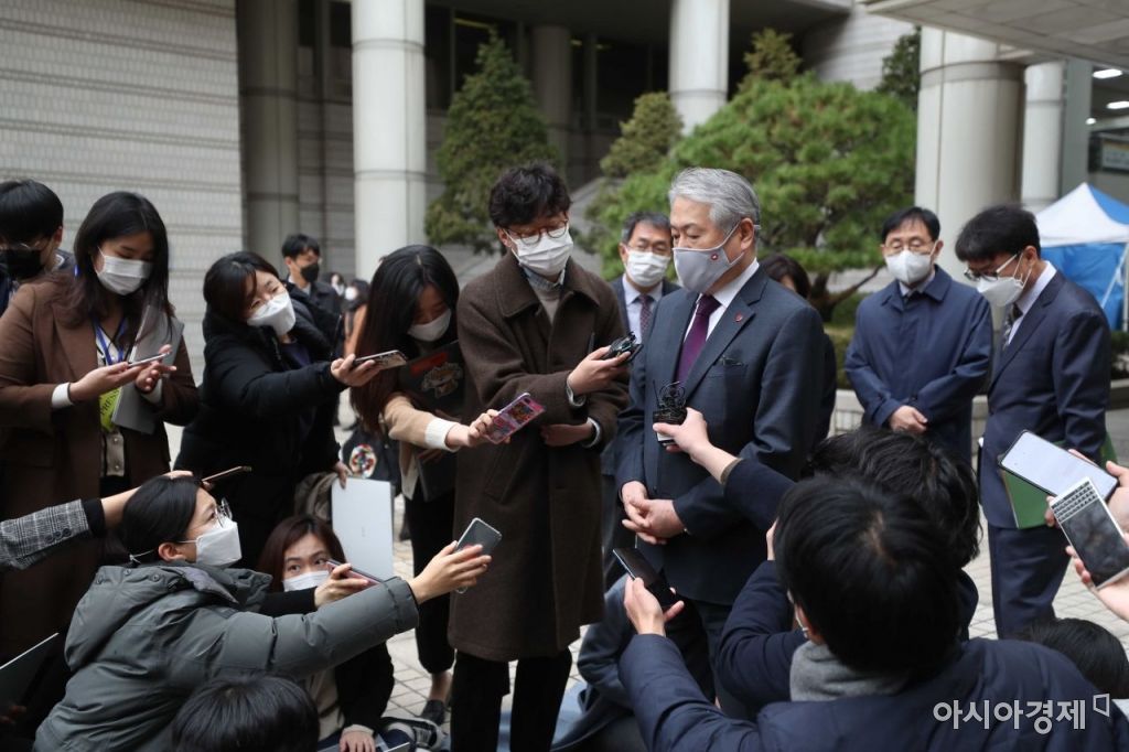 김용익 국민건강보험공단 이사장이 20일 서울 서초구 서울중앙지방법원 서관 앞에서 취재진 질문에 답변하고 있다. 이날 국민건강보험공단은 KT&G와 한국필립모리스, 브리티쉬아메리칸토바코(BAT)코리아 등 담배회사를 상대로 한 흡연 손해배상 청구 소송에서 패소했다. /문호남 기자 munonam@
