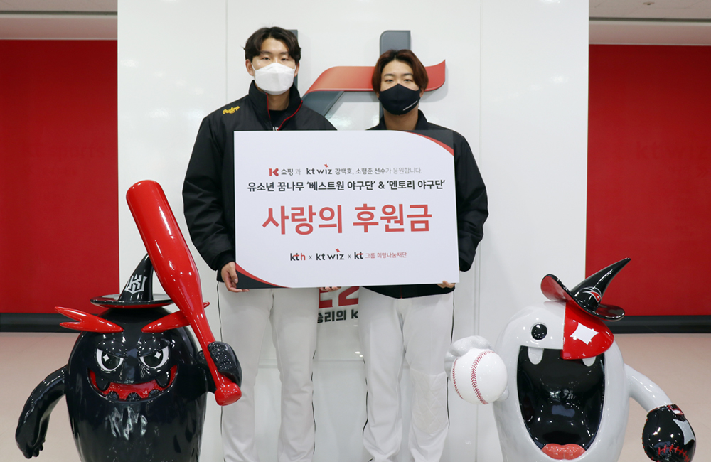 KTH가 kt wiz 야구선수의 시즌 성적에 따라 모금한 ‘사랑의 후원금’을 유소년 야구단을 위해 기부했다고 25일 밝혔다. 올해 ‘사랑의 후원금’ 마련에 동참한 kt wiz 강백호 선수(오른쪽)와 소형준 선수가 기념사진을 촬영하고 있다.