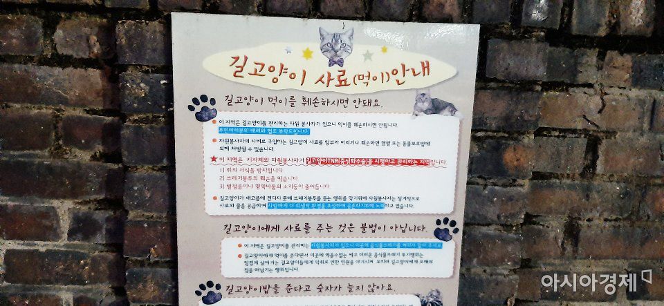 서울 중구 한 번화가 골목 담벼락에는 '길고양이 사료 안내판'이 내걸려있다. 안내문에는 "길고양이 먹이를 훼손하시면 안 돼요"라며 "이 지역은 길고양이를 관리하는 자원봉사자가 있으니 훼손하시면 안 됩니다"라고 당부했다. 특히 "이 지역은 지자체와 자원봉사자가 길고양이 중성화 수술을 시행하고 관리하는 지역입니다"라며 길고양이 돌봄을 하고 있다고 설명했다.