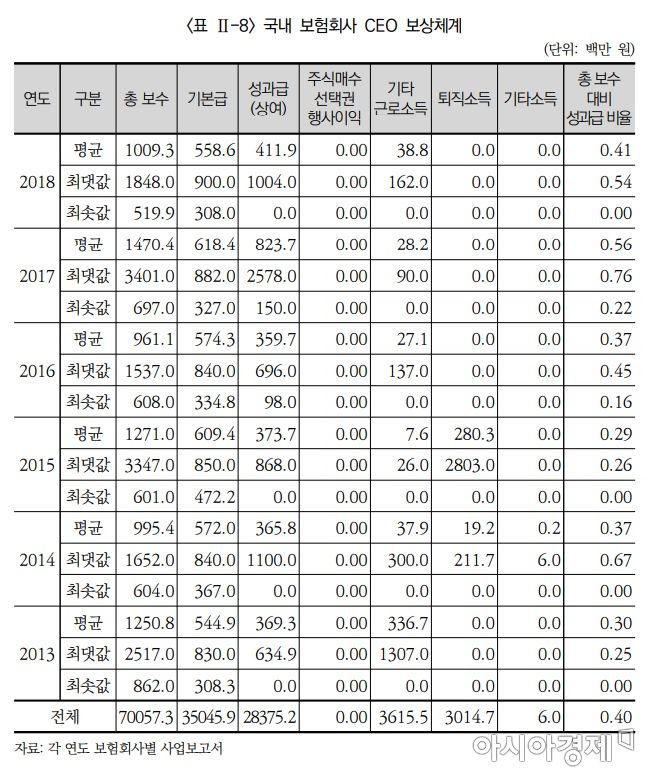 보고서는 CEO의 총보수 대비 성과급의 비율이 40.5%(생보 39.1%, 손보 41.8%)로, 전체 보상에서 성과와 연동되는 보수의 비율이 낮은 수준이라고 지적했다.