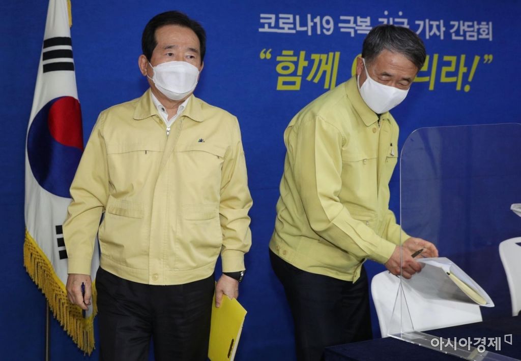 정세균 국무총리와 박능후 보건복지부 장관이 29일 서울 종로구 정부서울청사 브리핑룸에서 '코로나19 극복 긴급 기자간담회'를 마친 뒤 이동하고 있다. /문호남 기자 munonam@